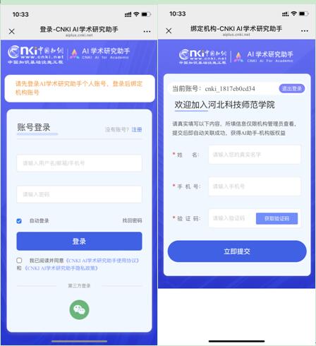 已有知网账号可直接微信扫描上方二维码,如无知网账号需先注册,登录成功后填写姓名、手机号相关字段,获取验证码后点击“立即提交”。