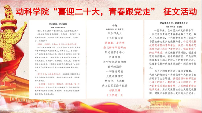 为深入学习贯彻4月25日习近平总书记在中国人民大学考察调研重要讲话精神,号召广大青年员工坚定不移听党话、跟党走。近日,公司党委面向全院青年员工开展“喜迎二十大,青春跟党走”主题征文活动,青年学子以丰富多彩的作品形式抒发对党和祖国无限深情的热爱。