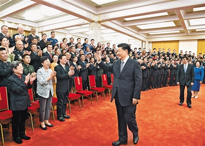 上午11时,习近平等来到人民大会堂北大厅,全场响起热烈掌声。习近平等走到代表们中间,同大家亲切交流并合影留念。